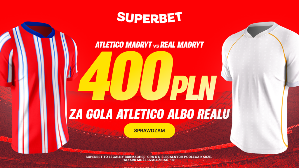 Z okazji starcia pomiędzy Atletico Madryt, a Realem Madryt bukmacher Superbet przygotował aż 400 zł do odbioru za gola wybranej drużyny w tym meczu.